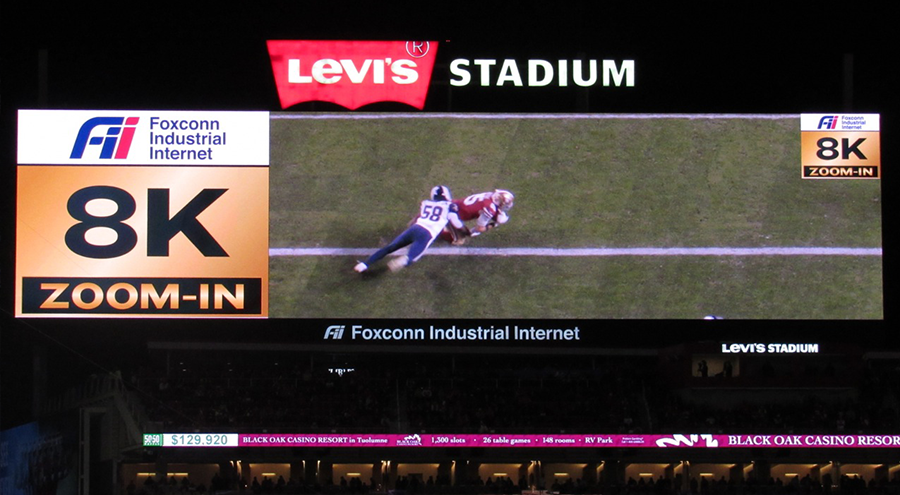 Born out of a partnership between the San Francisco 49ers and Foxconn Industrial Internet (Fii), the team has mounted five of Fii’s 8K cameras inside the stadium to provide extremely high-definition views of both end zones, as well as an “all-22” look at the entire field. Because the 8K technology provides such a high level of resolution, the Niners have been able to show replays on the stadium’s big screens that can zoom in extremely close, all the better to help resolve the outcome of game action.